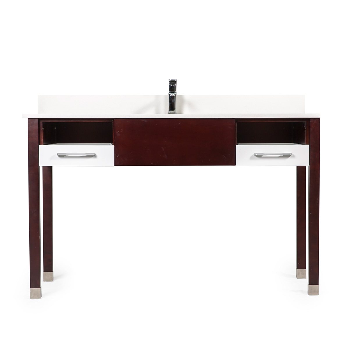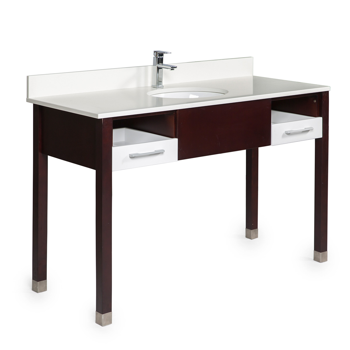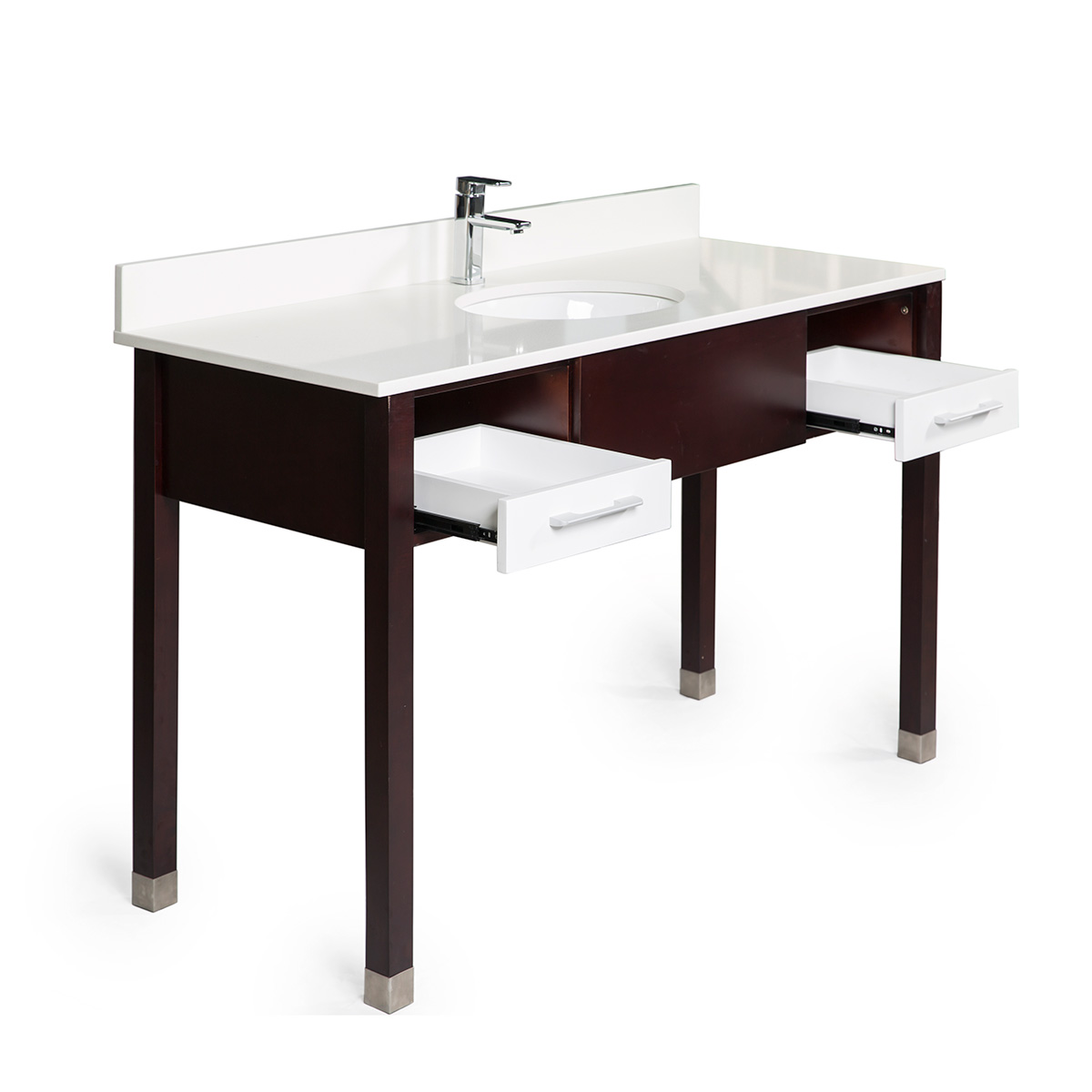 Blizzard white quartz vanity top works very well with the white drawer wood base cabinets and gives the freshness in the bathroom.