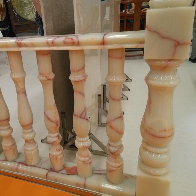 White onyx baluster is mainly used in luxury house. Onyx will be fade away in color and we don't suggest it for exterior usage. There are many other color onyx to be selected white pink green dark green black and so on. Contact us for more details on color and design.
