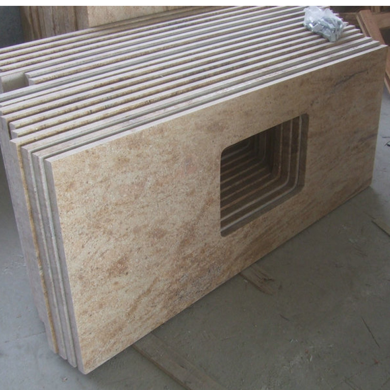 Kashmir Golden Granite Countertop is a yellow colored granite with black granules in its structure. The gold granite counter colors have also a sandy yellow minerals with peach and pink patches along with burgundy dots also featuring black veins. Another indication for Kashmir Gold granite features also various shades of golds and reds in a sandy yellow base.
