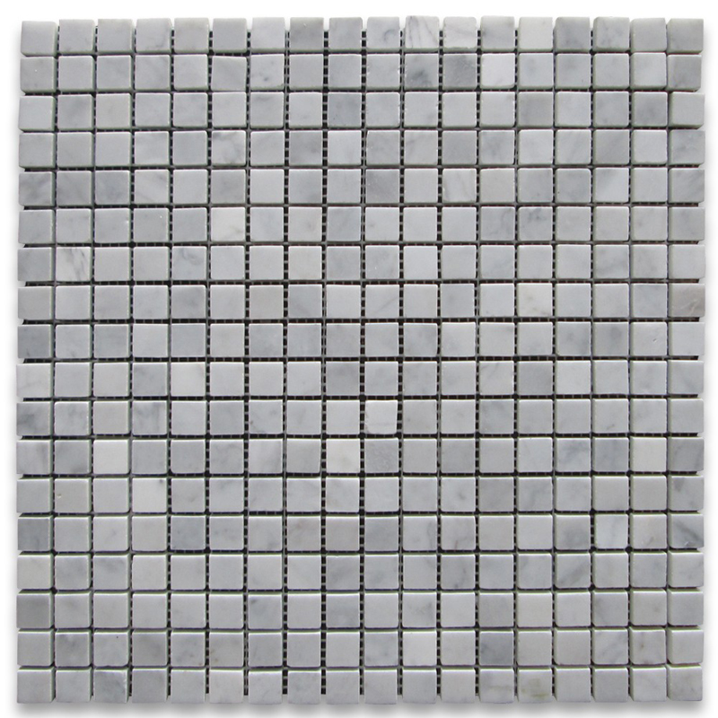 Italian bianco carrera white venato carrara honed 2 x 2 mosaic wall & floor. Square mosaic tiles can be used for a kitchen backsplash, bathroom flooring. Top rated selling designs