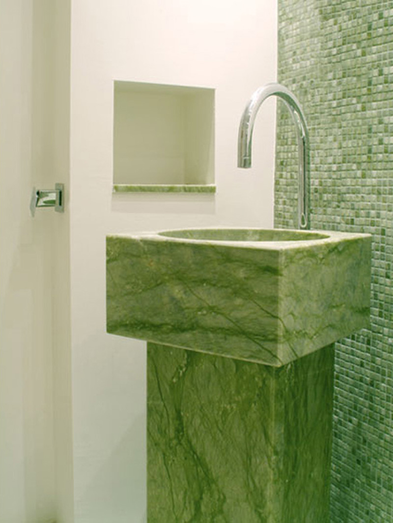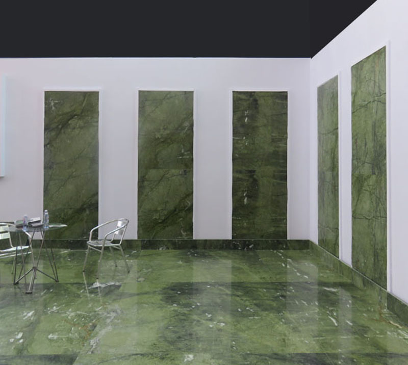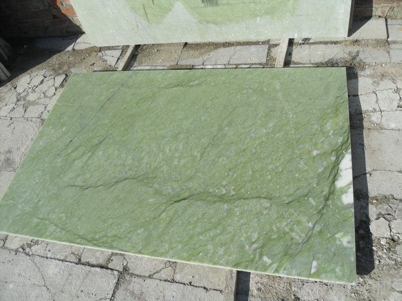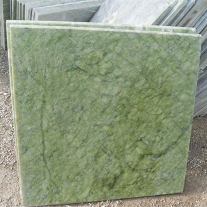 The green marble is a natural stone from China, dark color with some gold veins, cut to size for floor and wall in bathroom.
