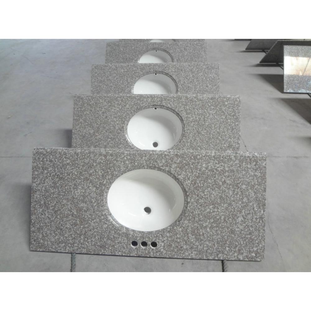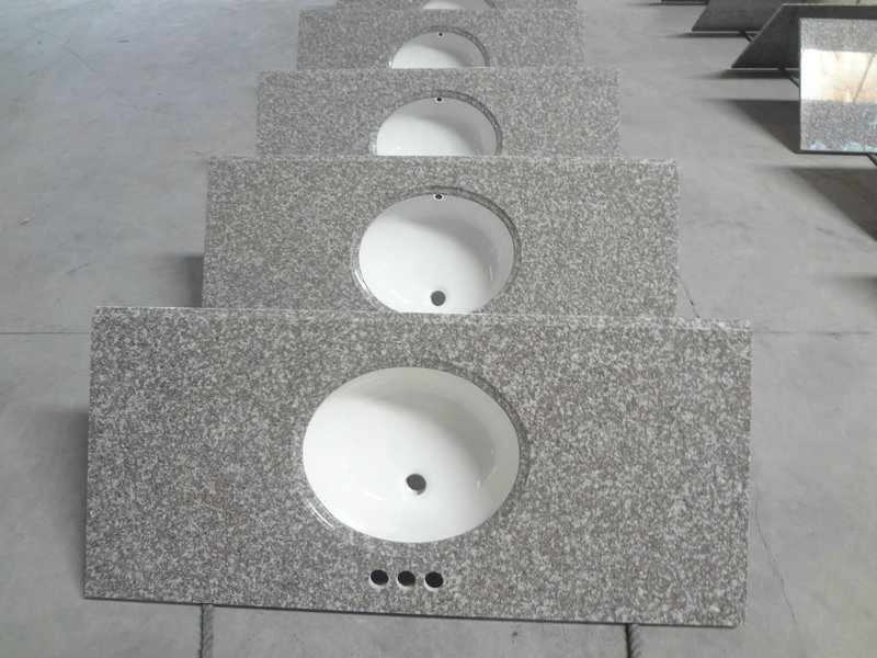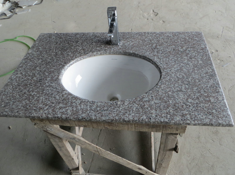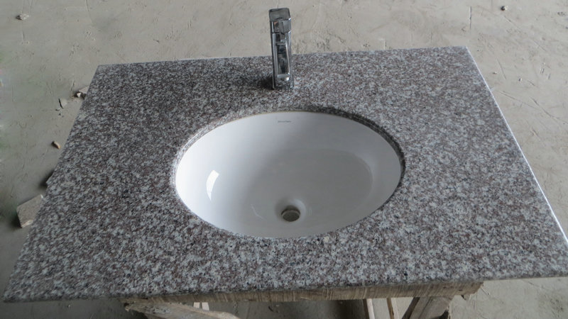 Bainbrook Brown Granite Vanity Top With Sink is a popular pink stone with hints of blacks and gray that blends well through out the slab.It complements the white cabinets and creates an interesting yet natural feel to the room. When combined with dark bathroom cabinets you would expect the contrast to be quite stark. But this is not the case and it flows beautifully.