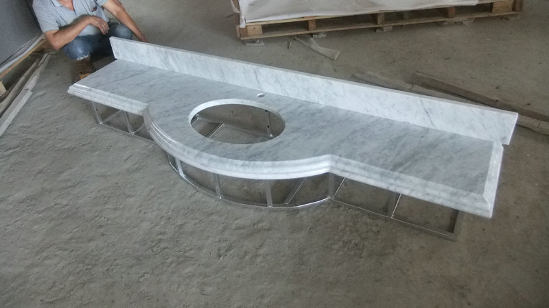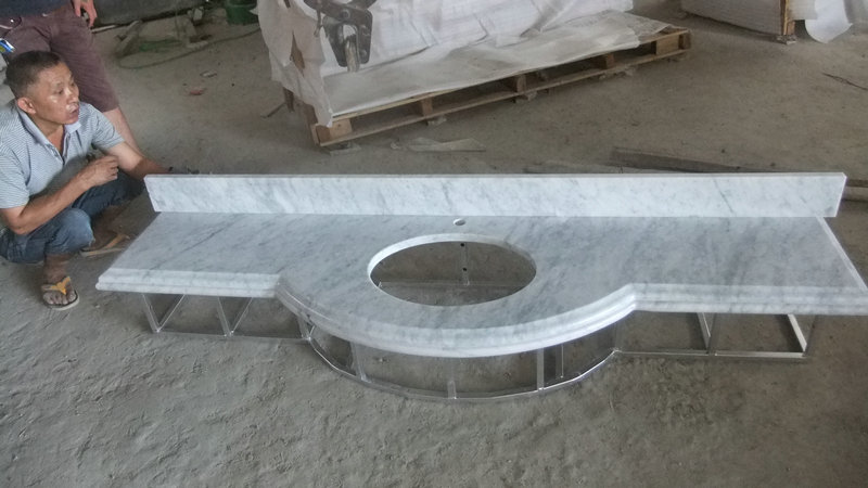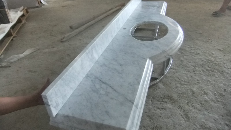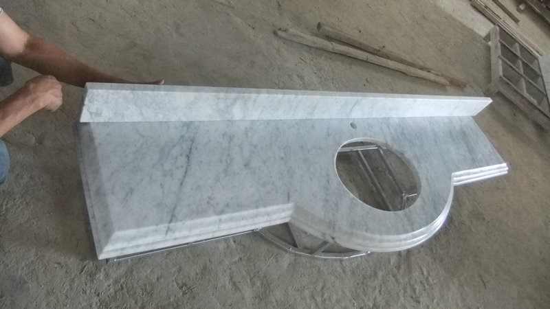 Bianco Carrara Marble Vanity Top is smooth and lightly polished for a classic look. Carrara, a timeless marble, lends grace and strength to both our contemporary and transitional vanity bases and exquisite sinks. Carrara Marble countertops are the main choice from the white marble countertops series, carrara well used for bathroom vanity top and kitchen countertop.