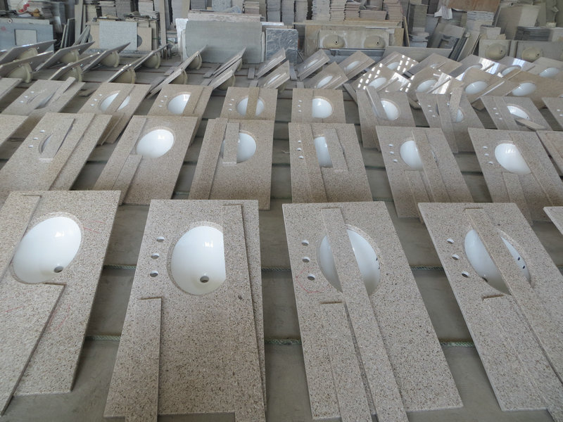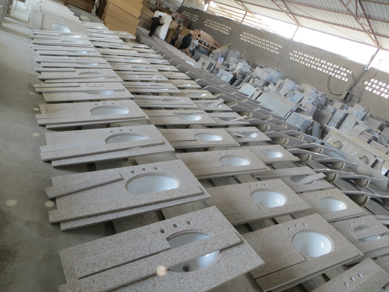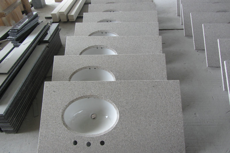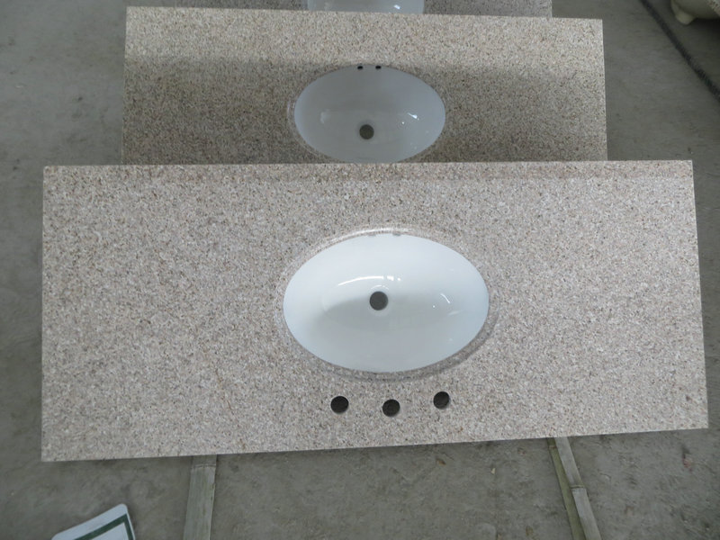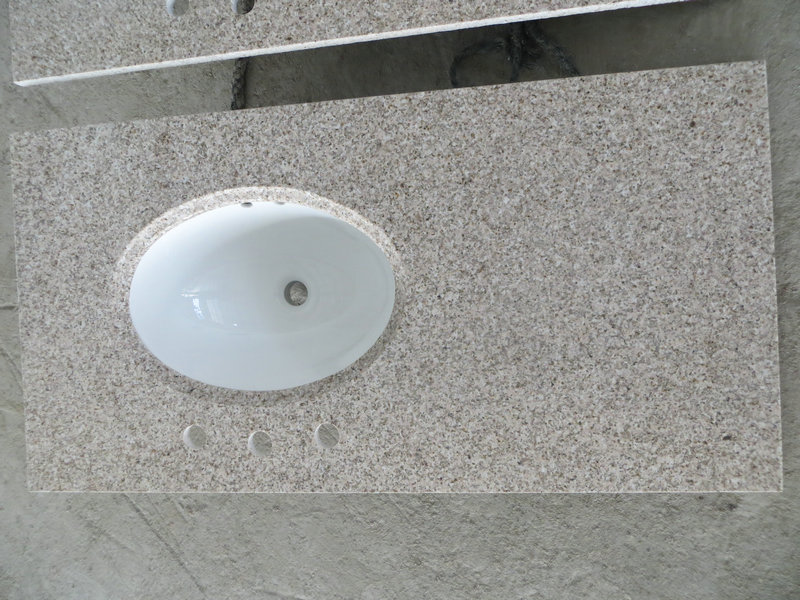Coast Sand Granite Vanity Top With Sink with dark cabinet is a obviours contrast between the light granite and the cabinets. However the high contrast is a little bit thanks again to the yellow tones and dark mineral deposits dots. This color combination can easily be used to create a modern and contemporary feel to your bathroom.