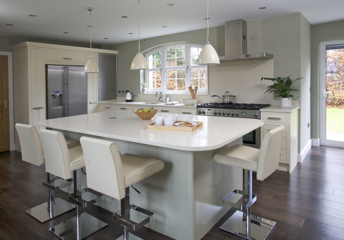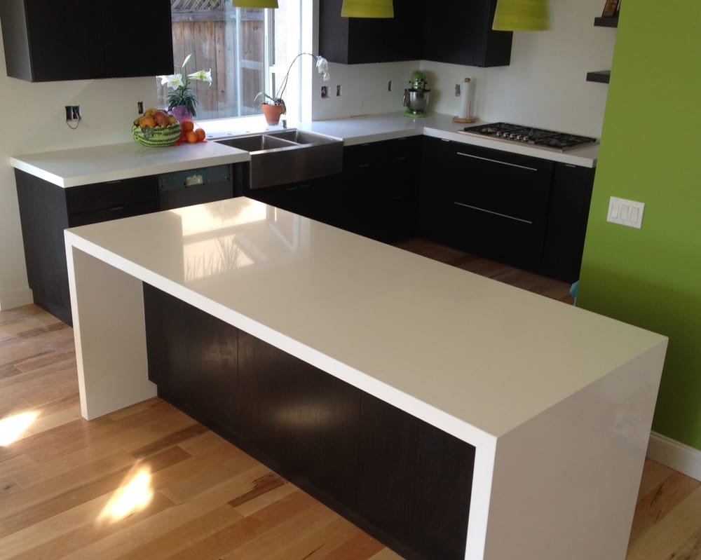 Pure White Quartz Island Tops looks clean white but is far more forgiving. Unlike marble or granite white quartz countertops is nonporous and doesn't require sealing. The Whitest shade of quartz work surface available. The stark hue offers an unparalleled solid bright and clean look with less grain than the anything else in the market. It's a great way to add glamour luster and brilliance to white quartz kitchen deseign.