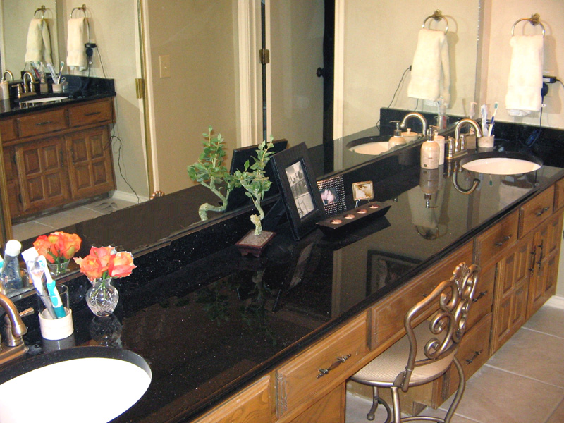 Black Galaxy Granite Vanity Top is black granite with golden silver and copper specks due to the presence of ferrous rich Enstatine. Black granite tops for bathroom vanity tops with white cabinet is so natural in today's designing world.
