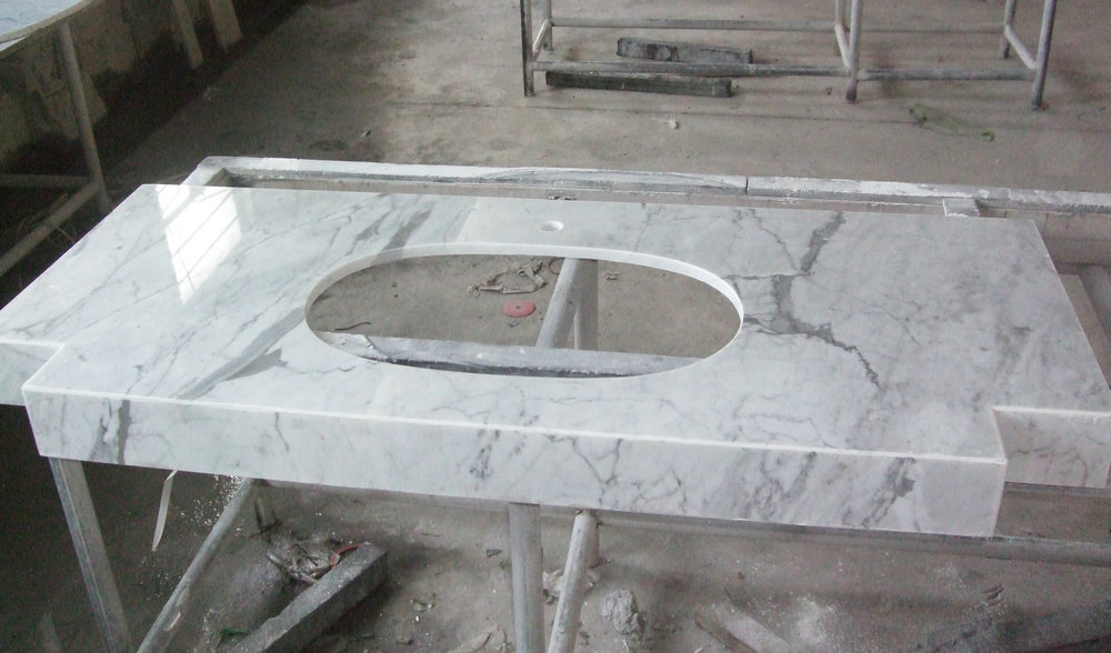Snow White Marble Vanity Top is the trend of luxury designs for five star hotels villas etc. The Statuary selection has a brighter semi-translucent white background color with a distinctive and dramatic veining pattern for white marble countertops bathroom. This white marble countertop also brings much luxury concept to your house.